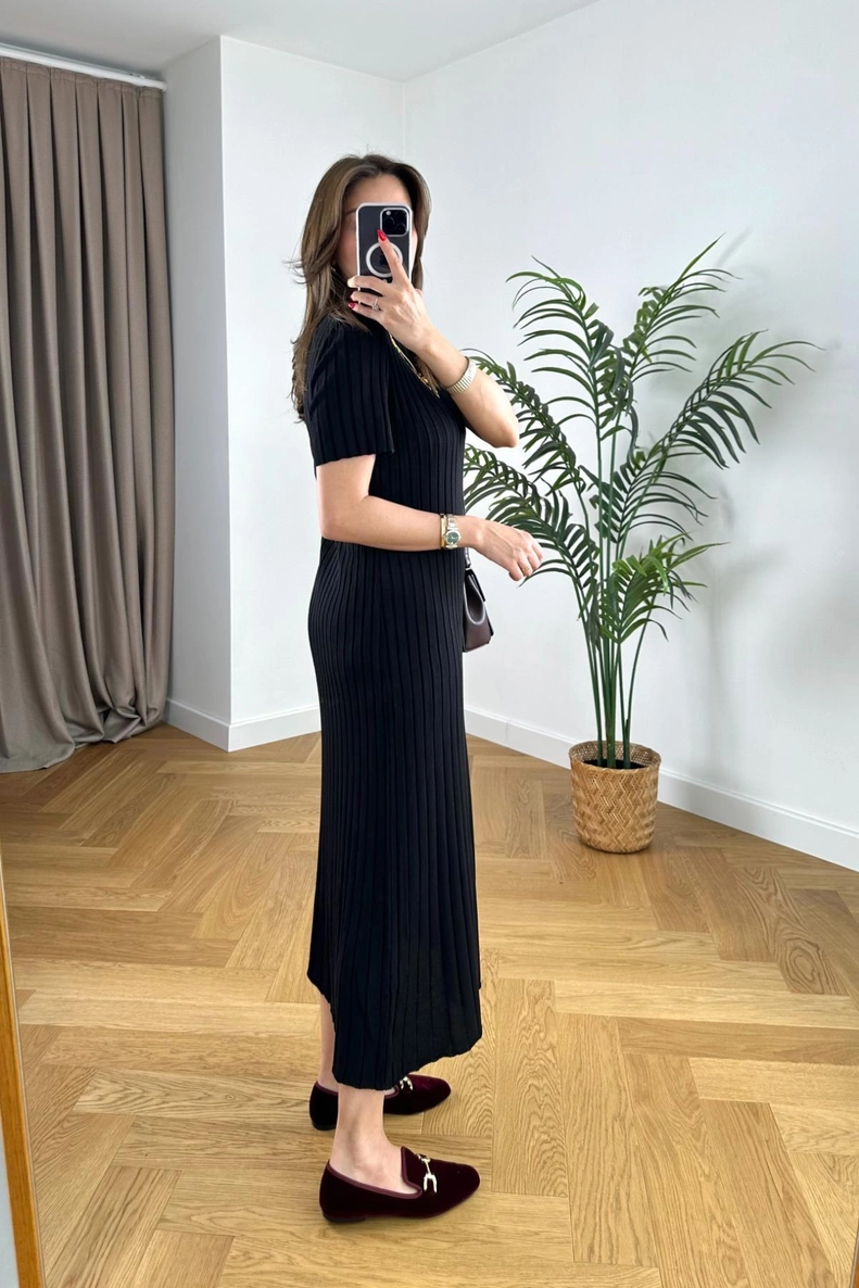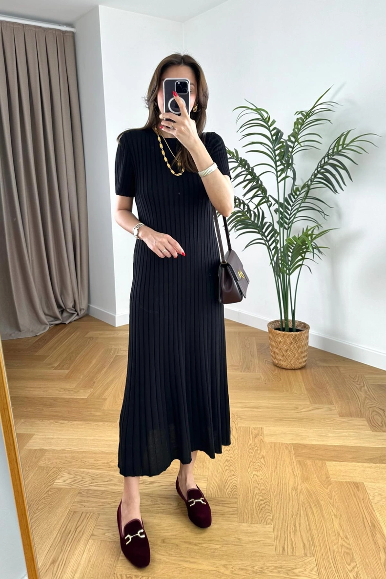 Cesy Siyah Yarım Kol Fitilli Elbise
