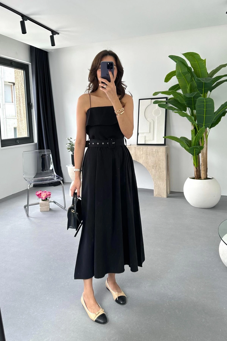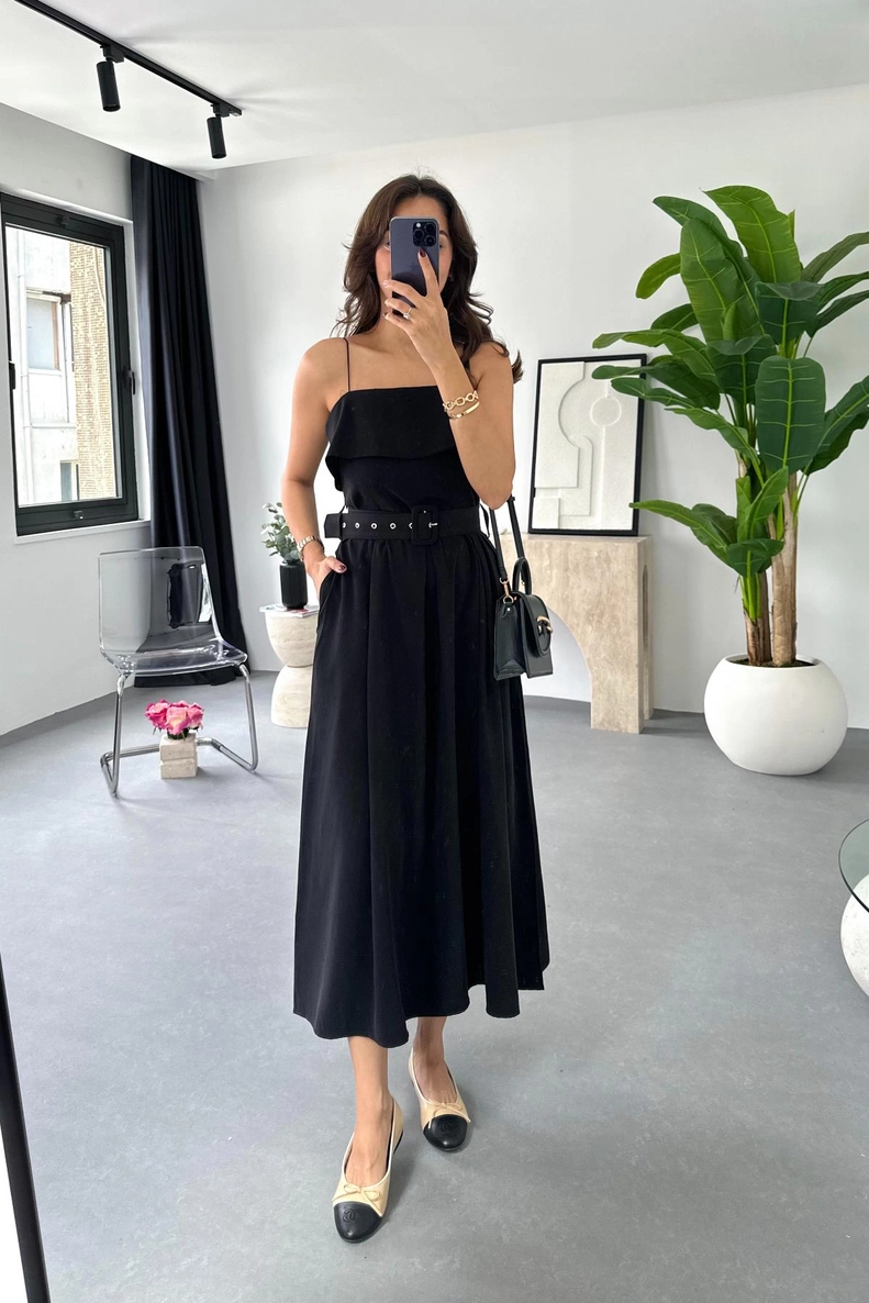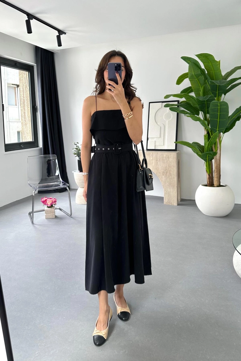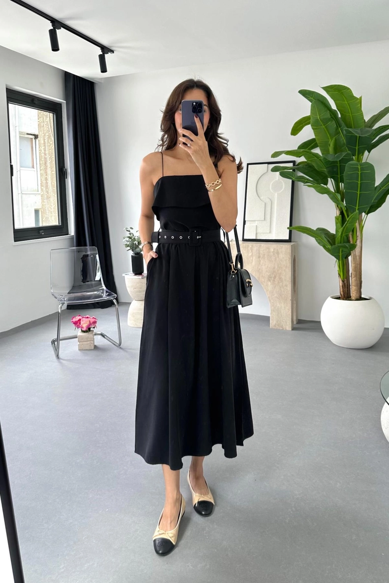 Chasy Siyah İp Askılı Kemer Detaylı Elbise