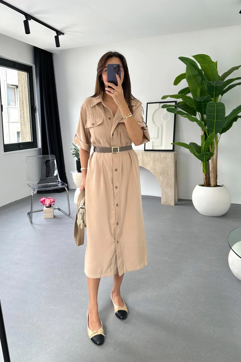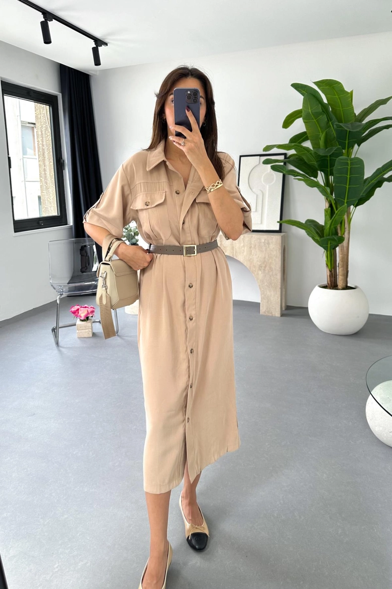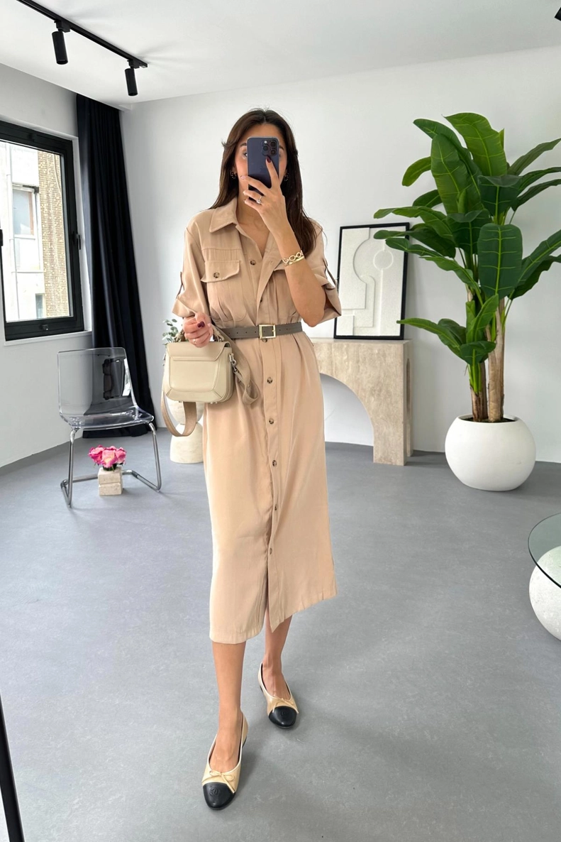 Ana Sayfa Elbise Dore Bej Cep \ Düğme Detaylı Kemerli Elbise