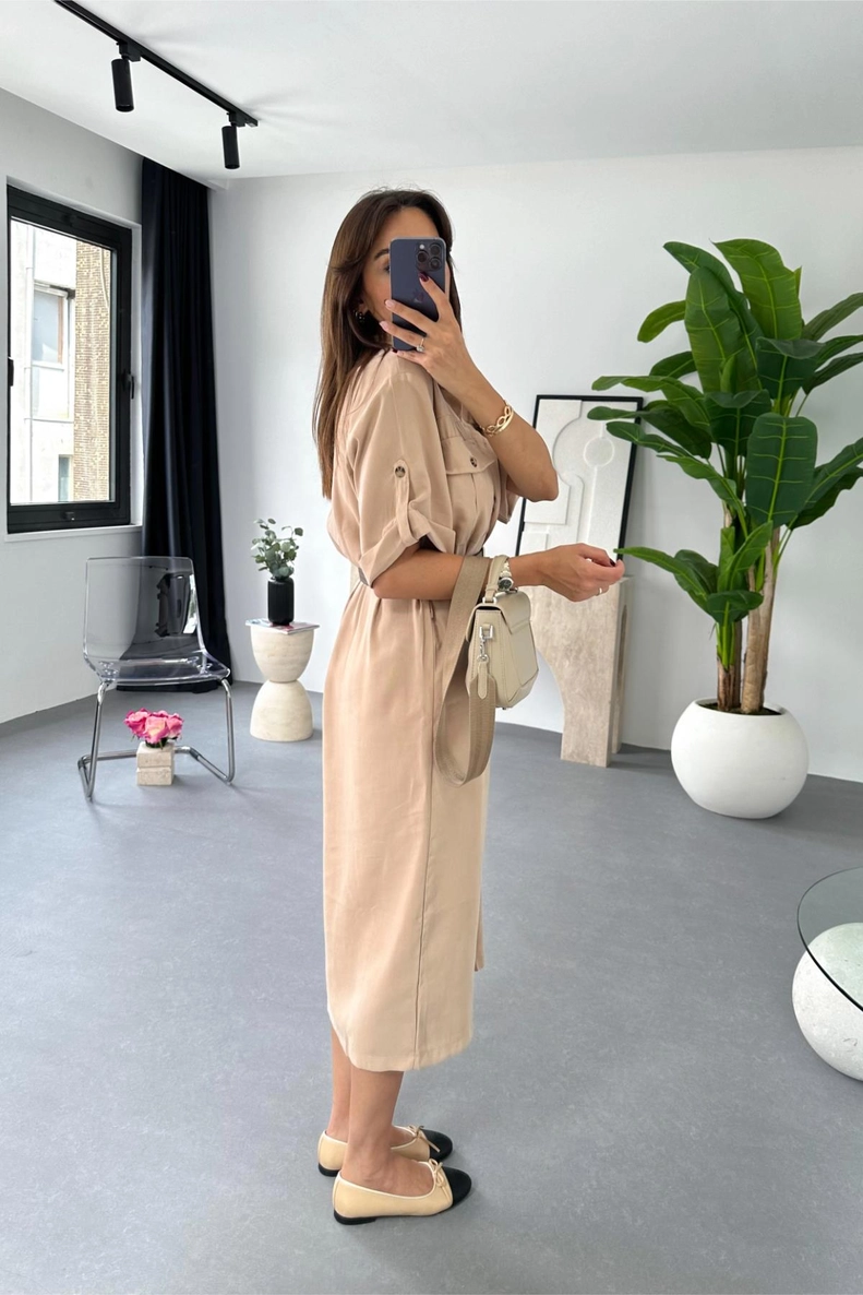 Dore Bej Cep \ Düğme Detaylı Kemerli Elbise