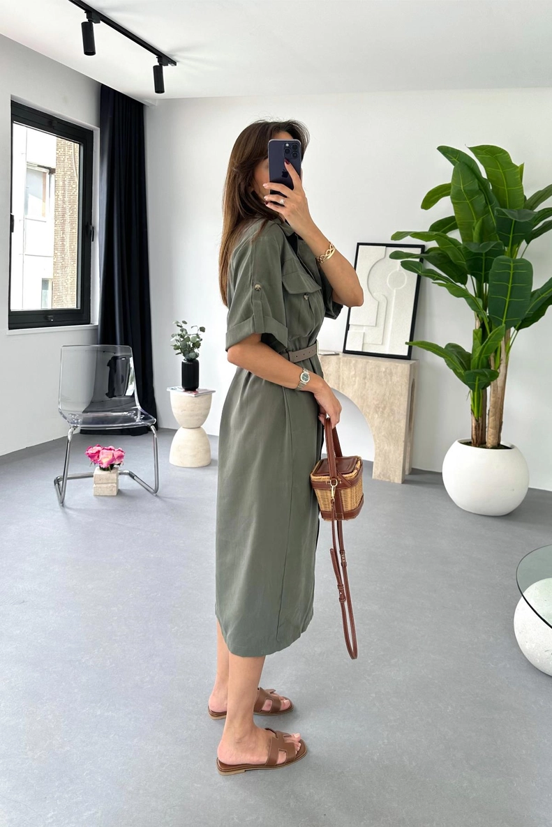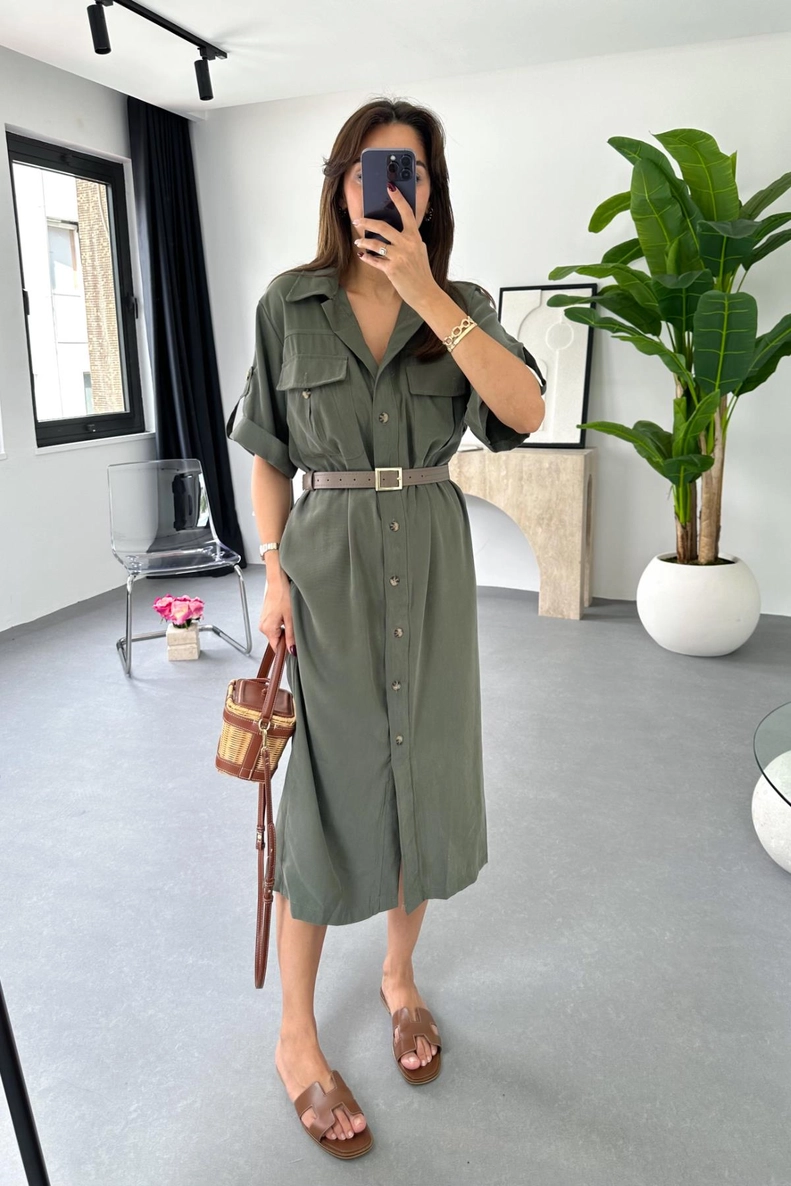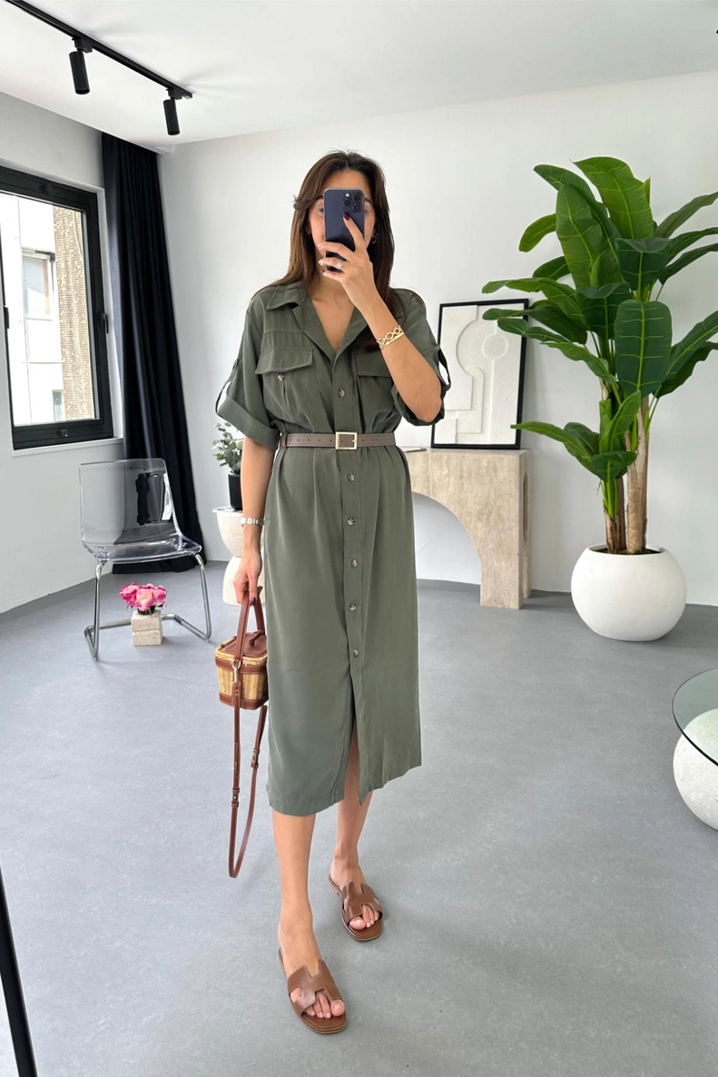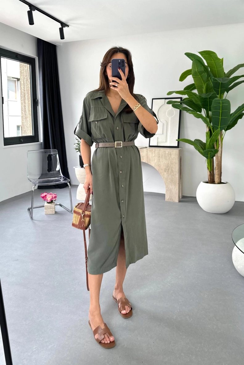 Ana Sayfa Elbise Dore Çağla Yeşili Cep \ Düğme Detaylı Kemerli Elbise