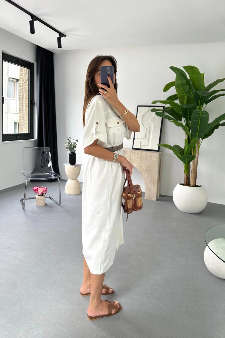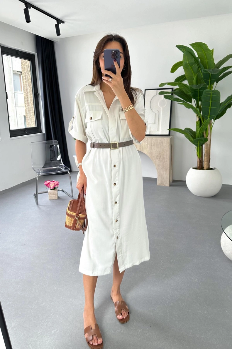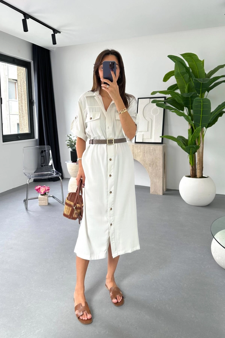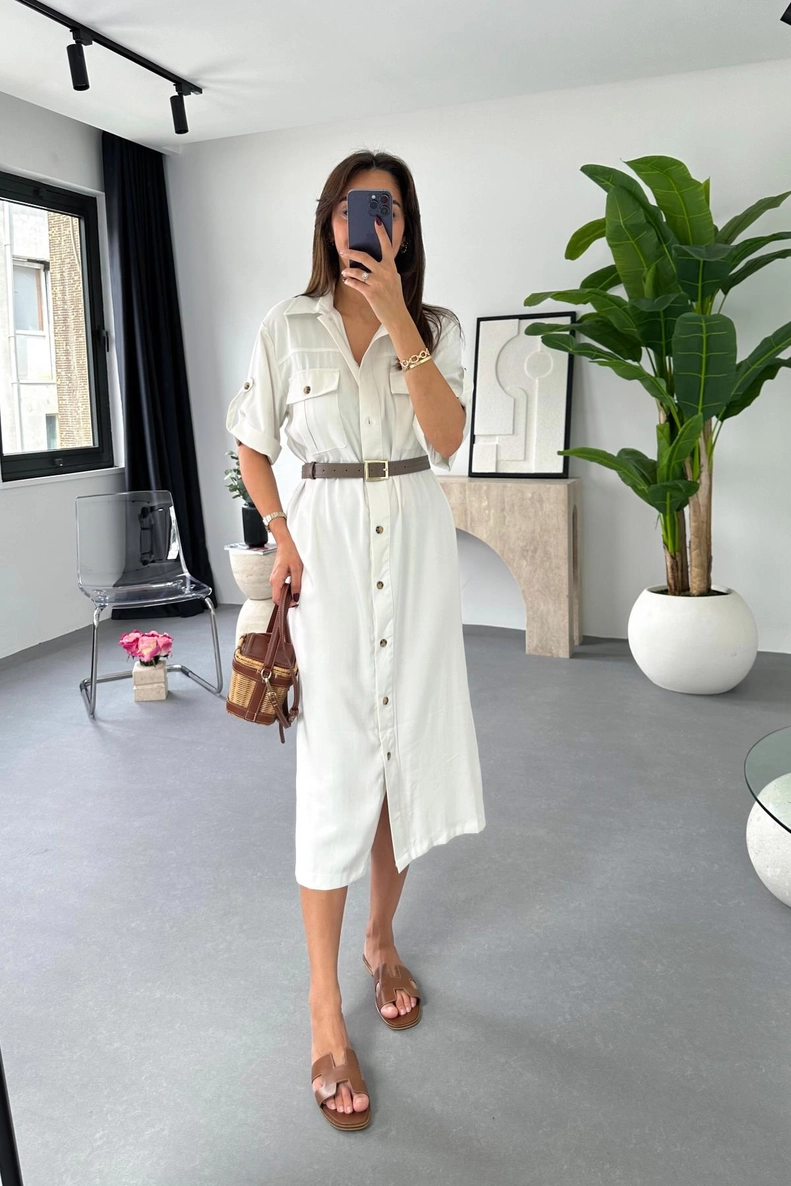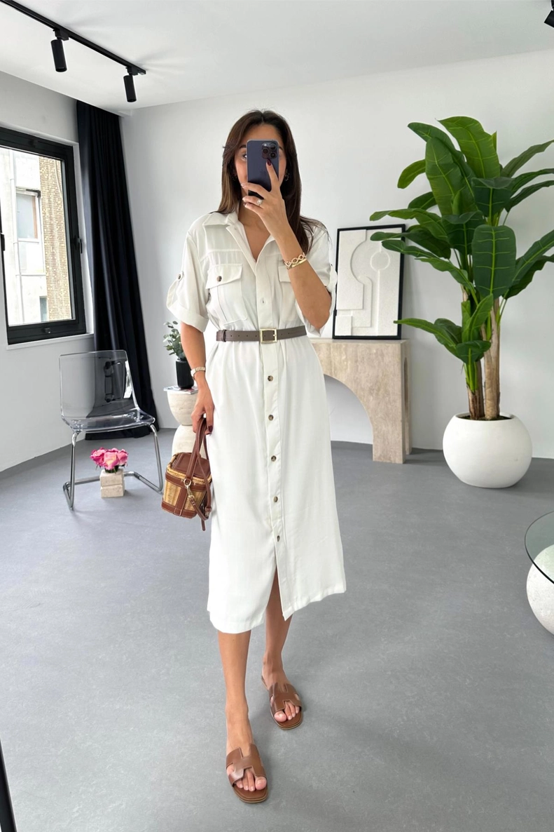 Dore Kırık Beyaz Cep \ Düğme Detaylı Kemerli Elbise