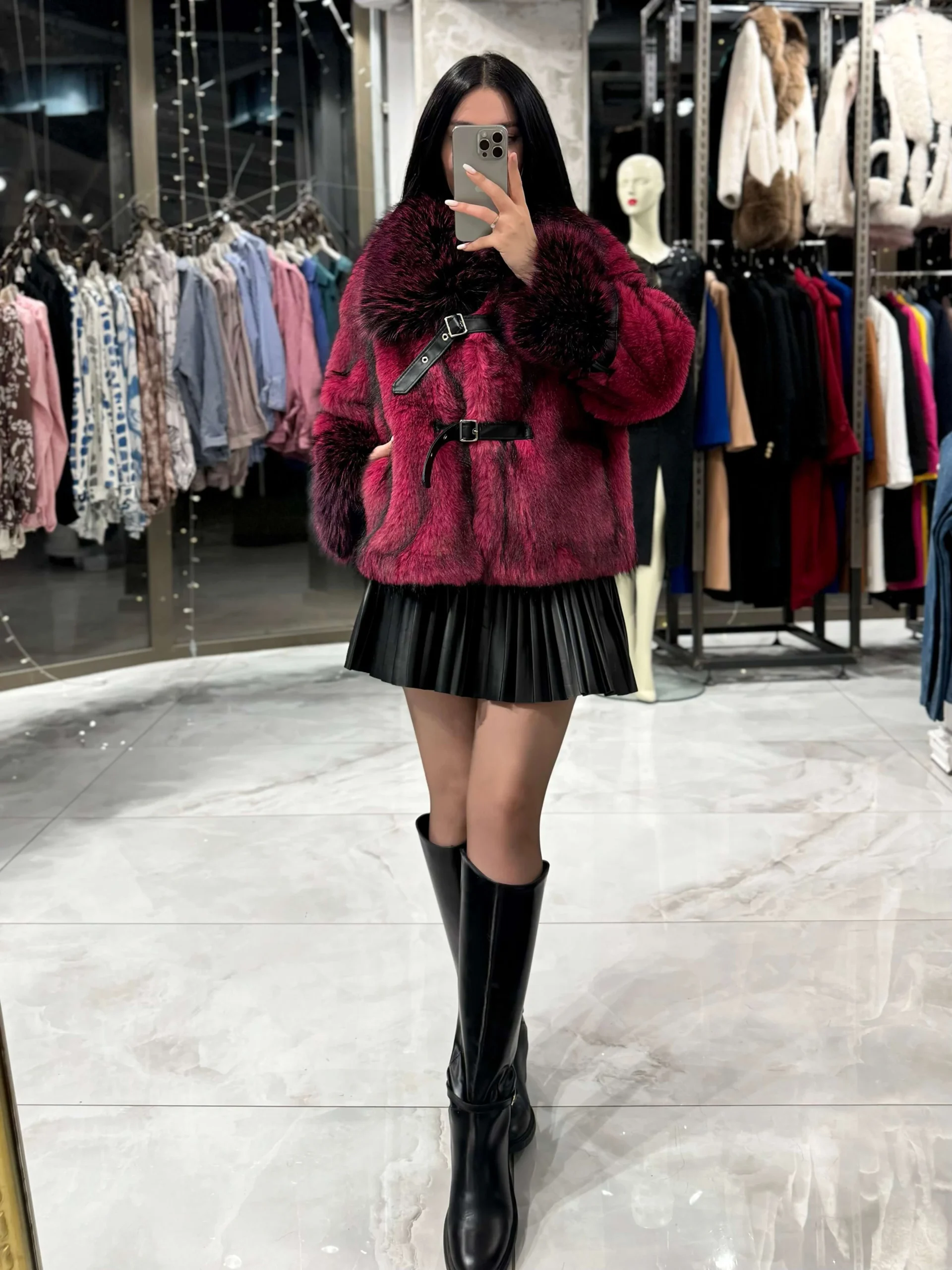 Foxy İthal VİP Deri Kemer Detaylı Tilki Görünümlü Benekli Yaka Detaylı Kürk Siyah Fuşya